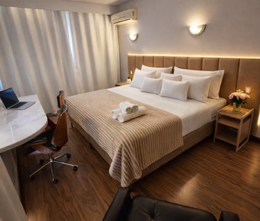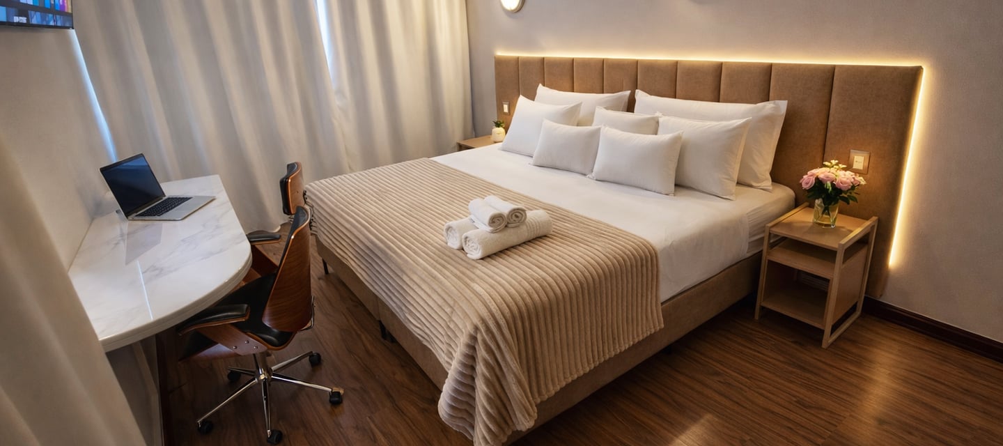 Com camas Super King, enxoval de alto padrão e ambientes espaçosos, o hotel entrega um nível de conforto diferenciado, ideal para quem valoriza qualidade no descanso.